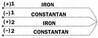 Iron-Constantan: Iron-Constantan (Type J, color coded white and red)generates about 50 µV/°C (28 µV/°F). The Iron wire ismagnetic. Junctions can be made by welding or soldering, using commonlyavailable solders and fluxes.