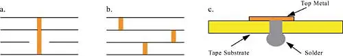 Figure 4. Examples of via types: a. thru-hole, b. blind, c. solderIn the commonly used tape designs, the solder from the solder ball itself will function as a via. In these designs, the top-layer metal covers perforations in the tape. The solder contained in the perforation will wet the underside of this metal and conduct the electrical signals to the spherical part of the solder ball (Figure 4c).