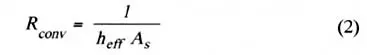 The total thermal resistance is composed of a conduction/spreading resistance and a convection resistance. The conduction/spreading resistance, Rsp, includes spreading effects and is influenced by the effective heat transfer coefficient acting on the surface. The convective thermal resistance, Rconv , is given by: