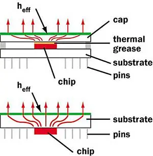 Figure 1. Example of spreading heat flow in two types electronic packages.Exact analytic solutions to the partial differential equations governing thermal spreading for situations similar to that described above have been reported in the literature [1,2]. These solutions address the general problem of determining the temperatures throughout multi-layer plates with multiple heat sources located on one side of a multi-layer structure with a uniform heat transfer coefficient applied to the opposite side. For the purposes of this article we will restrict our attention to a single square plate or thermal spreader with a centrally located square heat source on one side and a heat transfer coefficient applied to the opposite side. If we can determine the temperature, Tmax, at the center of the heat input area on the plate for a given heat transfer rate (i.e., power dissipation), q, and reference temperature, Tref, we can determine the total thermal resistance and its components (i.e., conduction and convection). The total thermal resistance from Tmax to Tref is simply: