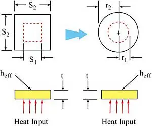 Figure 2. Transformation of square into circular geometry.Fortunately, Lee et al. [3] developed a closed form solution that can provide results very close to the exact solution and is easily amenable to incorporation in a spreadsheet or similar calculation scheme. The solution is based upon a circular plate with a circular heating area, so our square geometry must be first transformed into a circular geometry as illustrated in Figure 2. The transformation is based upon the areas of the plate and heat source being the same in both the square and circular geometries. So, the equivalent radii in the circular case are given by: