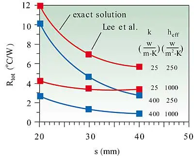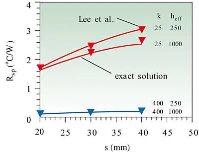 where W is the width of the spreader plate and L is the length of the plate. The plate length considered was varied from 20 to 50 mm. A plate thermal conductivity of 25 W/m�K and a heat transfer coefficient of 250 W/m2�K were used for these calculations. The results obtained for Rtot (i.e. conduction/spreading and convection) and Rsp (conduction and spreading) are shown in Figure 6. The percent error in Rtot between the exact solution and the simplified formulas is shown in Figure 7. As may be seen in the figure the percent error is progressively greater as the plate length increases.