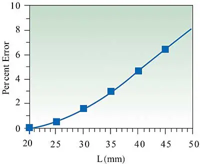 Figure 7. Percent error between the exact solution and the simplified formulas vs. plate length with fixed width equal to 20.0 mm.In summary the simplified formulas developed by Lee et al. provide a very useful tool for estimating the thermal spreading resistance of a square heat source and square spreader plate geometries.