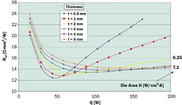It should be noted that the boiler resistivity (C-mm2/W) cannot be considered a constant for this technology. It will be dependent not only on heat flux but may, when lateral spreading is used, depend upon heat source size as well.