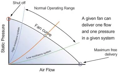 An energy viewpoint is helpful in understanding the fan performance curve.For example, at the shut-off point, the fan is in the condition of the maximumpotential energy. At free delivery, the fan is in the condition of the maximumkinetic energy. Although neither of these extreme conditions are likely tooccur in practice, they can be useful parameters in comparing fans.