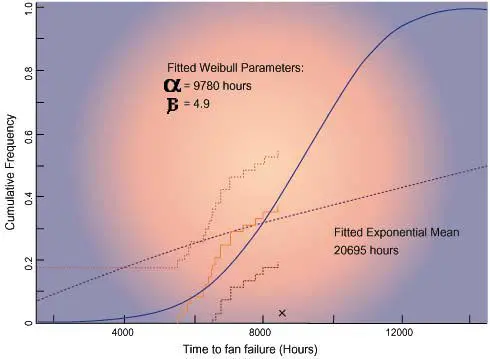 A few AMD vendors provide prospective customers with reliability informationbased on the exponential assumption. However, life test data, such as shown inFig. 1, does not support the use of the exponential distribution. Pastexperimentation and model fitting has shown that the Weibull distributionprovides a good fit to fan life data, because it accurately represents wear-outphenomena. Therefore, the use of the exponential distribution is misleading,because it distorts the data and ignores the wear-out of the AMDs.