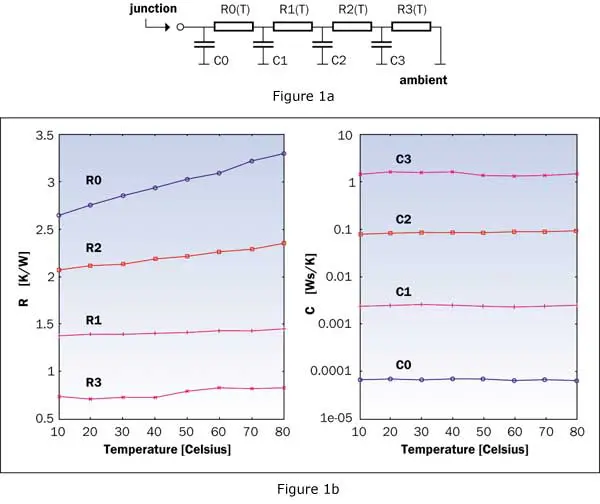 In order to collect information about the temperature dependence of package models, the same structure – a BJT (bipolar junction transistor) – was measured while the ambient temperature was varied between 10oC and 80oC in steps of 10oC. During the measurement, to assure linearity, the temperature rise was limited to 20oC. From every measured heating curve a 4-stage linear RC (resistance-capacitance) model of the junction-to-ambient heat-flow path was extracted by the NID (Network Identification by Deconvolution) method [11] (See Figure 1a). By changing the ambient temperature for consecutive measurements, temperature dependent material properties are also changed. In this way, by extracting the same kind of ladder model from every measured heating curve, the temperature dependence of the element values was identified (Figure 1b).