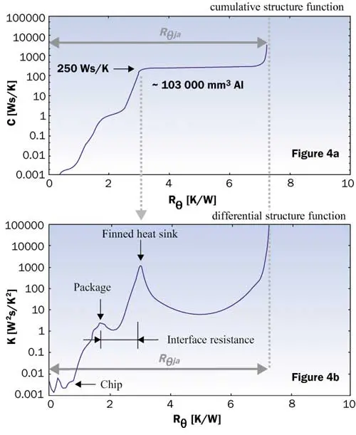 The 4-stage RC model shown in Figure 1a already gave a rough map of the path followed by the heat-flow, which was assumed to be essentially one-dimensional (including, for example, radial spreading). If the ladder had more stages, we would have an even finer map of the path. Since a long RC ladder model is very hard to interpret, the notion of structure functions was introduced [2]. Instead of considering a Cauer-type RC ladder of about 100-200 stages (Figure 2b), it is better to plot the so-called cumulative structure function (Figure 2a).