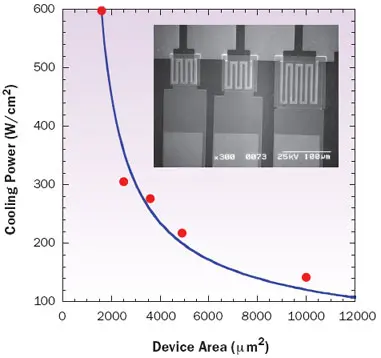Figure 3. The maximum cooling power density versus device size. Inset shows the fabricated thin film heater on top of the microrefrigerator.The experimental results shown in Figure 3 illustrate the maximum cooling power density of different size microrefrigerator devices. To measure the cooling power density of microrefrigerators, we fabricated a thin film heater layer on top of the device, which could work as both a sensor for temperature measurements and a heat source (see Figure 3 inset). During these measurements, we heated the heater using a constant current; at the same time we also measured the cooling of the microrefrigerators using a thermocouple or the resistance value of the heater.