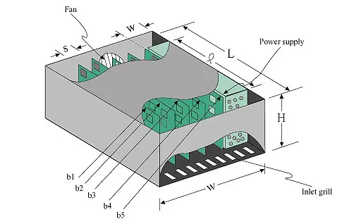 The fan-cooled enclosure shown in Figure 1 is used to illustrate the method.The forward portion of the bottom panel is slotted (about 50% open) to providean inlet grill. The internal geometry consists of five circuit board channelsand a power supply. The power supply is totally sealed with the exception ofthe front and rear panels, each of which is perforated in a manner that providesabout 35% open area for airflow. It shall be assumed that the power supply isapproximately 50% filled with typical electronic components on a 0.025 m pitch.