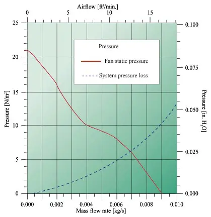 The fan characteristics are illustrated in Figure 2 as fan static pressurevs. mass flow rate. Such a curve is required for a system analysis and isusually obtained from the fan manufacturer’s product catalog. The dashed curveindicated as system pressure loss will be discussed later, but it should bementioned here that one of the desired results of any system analysis is todetermine the system operating point as indicated by the intersection of the fanstatic pressure and system pressure loss curves.