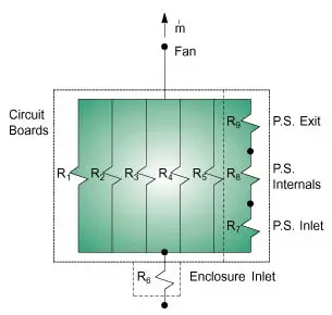 The typical first-order system analysis of a forced-air cooled enclosureuses a circuit representation where pressures (relative to the external ambient)may be calculated at node points and air flow may be calculated in resistiveelements, (see [1] for additional detail). It should be clear that the accuracyof this method is dependent on the ability of the analyst to: