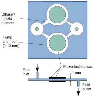In a research project at the Royal Institute of Technology we have developeda pump based on a new fluid pump principle with no valves. The pump consists oftwo fluid flow rectifying diffuser/nozzle elements which are connected to theinlet and outlet of a pump chamber with an oscillating pump diaphragm, as shownin Fig.1. The diffuser/nozzle element has a lower flow resistance in thediffuser direction (indicated by the larger arrow), i.e. in the direction ofincreasing cross-sectional area, than in the opposite nozzle direction(indicated by the smaller arrow). This means that the diaphragm oscillationresults in a new flow in the diffuser direction. Both conical and flat-walleddiffuser/nozzle elements can be used.