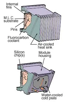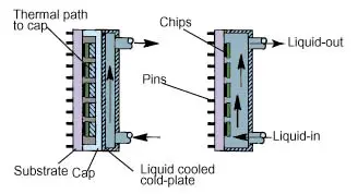 Indirect liquid cooling is one in which the liquid does not contact themicroelectronic chips, nor the substrate upon which the chips are mounted. Insuch cases a good thermal conduction path is provided from the microelectronicheat sources to a liquid cooled cold-plate attached to the module surface, asshown in Figure 1. Since there is no contact with the electronics, water can beused as the liquid coolant, taking advantage of its superior thermophysicalproperties.