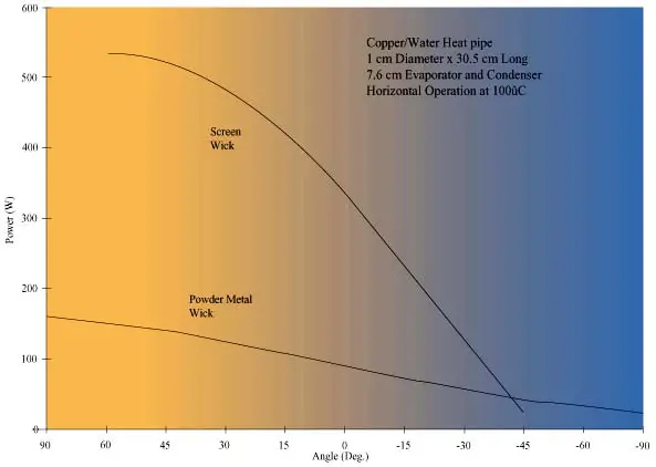 The capillary limit is set by the pumping capacity of the wick structure. As shown in Figure 4, the capillary limit is a strong function of the operatingorientation and the type of wick structure.