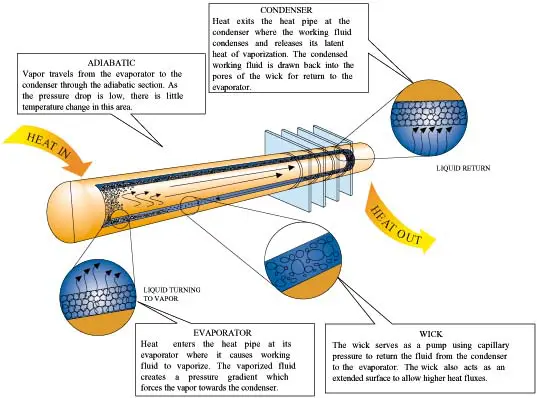 As heat is input at the evaporator, fluid is vaporized, creating a pressuregradient in the pipe. This pressure gradient forces the vapor to flow along thepipe to a cooler section where it condenses giving up its latent heat ofvaporization. The working fluid is then returned to the evaporator by thecapillary forces developed in the wick structure.