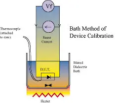 During device calibration, data should only be taken once thermalequilibrium has been reached by the device within the calibrating environment. Since the device under calibration is only heated by the minute self heatingartifact generated by the sense current, the outside surface of the device willnearly equal the internal temperature of the semiconductor once equilibrium withthe environment has been reached. Prior to this condition, the calibrationenvironment (bath liquid) must remain steady for a sufficient period of time. The waiting time then for equilibration from the outside to the inside of thedevice is determined by the heat capacity of the device and the thermalresistance between the device junction and the calibrating medium. A stirredliquid bath provides an excellent calibration medium to minimize this waitinginterval. Generally, the larger the component under calibration, the longer thewaiting interval. These considerations are essential to controlling systematicdevice calibration errors.