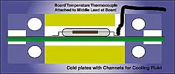 The method being considered to determine JB by the JEDEC JC15.1 committee uses a cold plate in a “ring” or “window frame” configuration clamped on both sides of the printed circuit board with the top of the package and the bottom of the board insulated as illustrated in Figures 2 and 3. The assumption is that the important thermal resistance to the board is the thermal resistance from the junction to the edge of the package where the package footprint connects to the rest of the board. Hence, the board temperature is measured by attaching a thermocouple to a trace at the edge of the package.