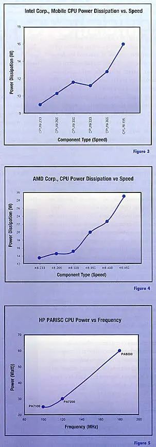 As previously stated, technology trends are driving CPU designs toward higher powered multi-chip module designs. High powered multi-chip modules, such as Intel’s Pentium, Descheuttes, Merced, as well as RISC-based processors from HP, have been and are becoming standard throughout the industry. The quest to thermally manage these types of devices is becoming increasingly more difficult given that demand for increased processor speed continues to grow. The relationship between processor speed and power dissipation ensures ever-increasing power dissipation levels. The result of this speed-power relationship ensures thermal design challenges for years to come. (See Figures 3, 4 and 5.)