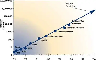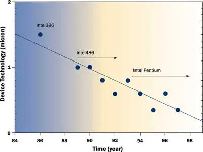 It is fascinating to observe how closely the microprocessor industry has followed Moore’s law. Incidentally, it is useful to note that this trend also applies to components other than microprocessors. Although little industry data is available, the evolution of CMOS technology clearly suggests the same trend.