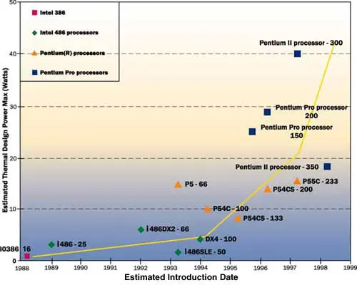 Figure 2. Time-line plot of Intel corporation microprocessor power dissipation.