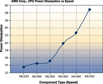 Figure 3. Power dissipation of the AMD Corp. K6 family of microprocessors as a function of time (clock sppeed reflects time history).