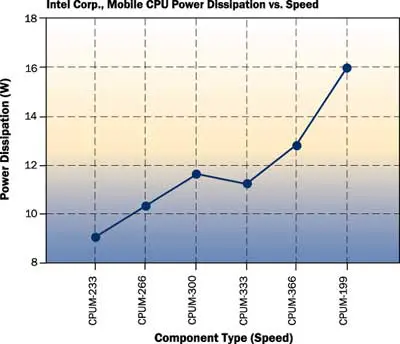 Figure 4. Power dissipation of the Intel Corp. family of mobile microprocessors as a function of time (clock speed reflects time history).