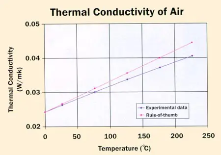 In the Technical Data column of ElectronicsCooling Magazine, September 1998, the thermal conductivity of gases in general has been discussed. A few sentences were devoted to the temperature and pressure dependence of the most common gases. For example, it was stated that above 0.001 bar, the increase in thermal conductivity is of the order of magnitude of 1% per bar increase of pressure. From these figures, it can be concluded that changes in thermal conductivity due to atmospheric variations can be neglected in most cases. Also, it was noted that the thermal conductivity at atmospheric pressure is almost proportional to the absolute temperature. Let us check the correctness of this rule-of-thumb.