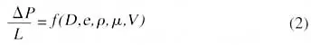 is divided by the length of pipe tested in order to obtain a pressure drop per unit length of pipe as a function of pipe diameter, wall roughness, mass density, dynamic viscosity and velocity. This is denoted functionally as