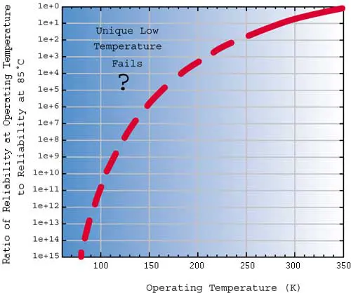 Figure 3. CMOS device fails as a function of temperature according to Arrhenius relation.However, some recent information suggests that there are other defects that are unique to low temperature [8]. These defects, undetected at normal operating temperatures, manifested themselves as timing failures at or below 0oC due to an increase in electrical resistance at the defect. In fact, testing at low temperatures is now being used as a screen to catch silicide opens that would otherwise go undetected under normal testing but fail later in product life [9]. This new data suggests that reliability could potentially get worse as you go to lower and lower temperatures.