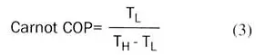 where TL, the low temperature reservoir temperature, is associated with the evaporator surface temperature, and TH, the high temperature reservoir, is associated with the condenser ambient temperature. Actual COP is often expressed as a percentage (or fraction) of Carnot COP. It is in this context that the actual COP of selected refrigeration technologies is compared to Carnot COP (Figure 4) as the evaporator decreases in temperature down to 77 K [11, 12].