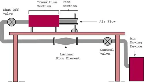 The test apparatus for measuring module surface convective transfer is shown in Figure 1. The essential components of the apparatus consist of the card test section, transition section, laminar flow element, and air moving device. Air from the laboratory room is drawn over the card through the transition section to the laminar flow element where the card air flow rate is measured. The downstream placement of the blower precluded preheating of the air, which might have occurred had the blower been upstream.