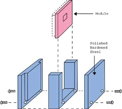Figure 2. Module casting mold.The casting procedure involves several steps. The module with its housing removed is slipped into the mold so that when the pins are touching one surface of the mold a uniform gap exists above the substrate into which naphthalene is poured. To prevent naphthalene from spilling over into the region of the pins, pressure-sensitive tape was used to mask off this region.