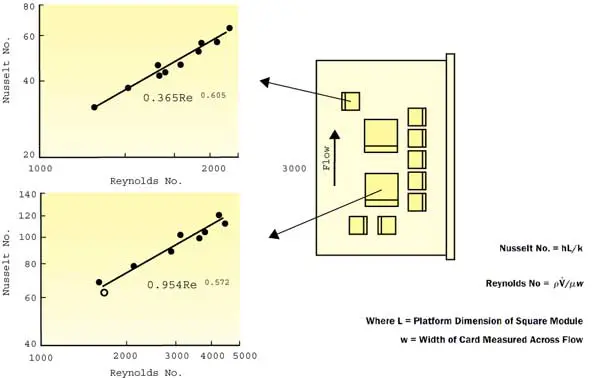 The mass transfer technique has been described to obtain the convective heat transfer from the surfaces of electronic modules mounted to a printed circuit card. Although not discussed here, this technique has been successfully applied to determine average convective transfer coefficients from card surfaces, finned heat sinks, and corrugated passages, as well as localized convective transfer coefficients [6].