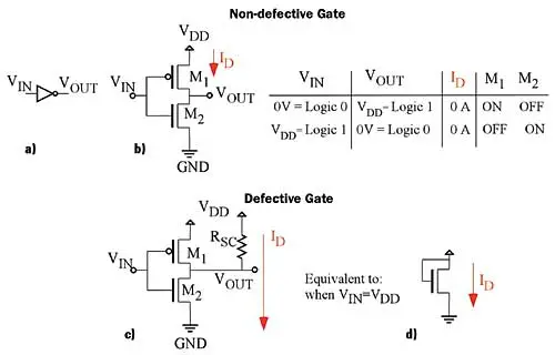 Figure 1. Schematic of a fault-tree and faulty CMOS logic inverter. The conducting state of the transistors is indicated in the table for the different values of the VIN voltage.Let us focus on the detection of structural defects in a circuit. If a circuit has a structural defect, some of its devices may dissipate power levels different from the nominal ones, and these different power levels may, in turn, alter the surface thermal map of the silicon surface. Figure 1 shows a typical example of what may happen in a digital circuit: a short circuit appears between the supply line, VDD, and the output line of an inverter. The electrical model of this kind of short circuit is a resistor, RSC, that usually has a low value. Therefore, when a logic one drives this gate, current flows from VDD to GND, the NMOS transistor, M2, behaves as a heat source, and a hot spot appears. Thermal measurements of the IC surface can detect this kind of defect.