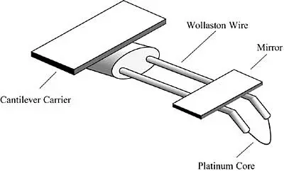 Figure 2. Schematic of the SThM thermal probe.The probe is a Wollaston wire shaped as a tip and etched to uncover the core platinum(Pt) wire (Figure 2). The Pt wire is used as a thermal resistor. At constant input current, the tip voltage is measured while scanning the surface so that the Pt wire electrical resistance can be calculated at each point on the sample surface. The AFM is used in contacting mode so that thermal equilibrium is achieved between the probe and the surface. A preliminary calibration allows us to relate temperature variations to electrical resistance variations to an accuracy within 10%. The contact radius of the tip can be estimated to 50nm [4], its diameter being 5 microns. A laser beam reflects on the mirror to detect z-deflections of the cantilever with nanometer precision, allowing us to extract topographic maps of the IC surface.