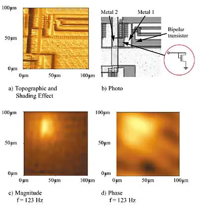 Figure 3. Topographic and AC temperature measurements performed with the SThM.Figure 3 shows measurements performed with the SThM. Figure 3a shows a processed topographic image while 3b shows a photograph of the same location on the layout. Comparing Figures 3a and 3b allows us to easily identify and locate the metal lines and devices (i.e., the MOS transistors acting as heat sources and a bipolar transistor). If the power dissipated by the heat source is a harmonic function, i.e., P(t)=PMAX�cos(wt), then the temperature at a distance, r, from it would be T(t,r)=TMAX(r)�cos(wt+(r)). The measurement of both amplitude, TMAX(r), and phase,