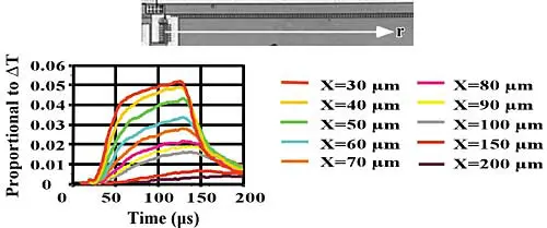 Figure 4. Example of amplitude transient temperature measurements performed with the laser thermoreflectometer.Figure 4 shows an example of transient measurements. At the top of the image is a photo of the activated heat source and an axis where different measurements have been performed. Following this line, the thicknesses of oxide and passivation layers are assumed to be homogeneous and, therefore, so is the constant, . The heat source has been activated with a power pulse of 23 mW for a duration of 100 �s. Temperature waveforms have been extracted at different distances from the heat source. In this example the diameter of the laser beam is 3 mm, therefore measurements can be assumed to be highly localized. As can be seen, the bandwidth of the measurement probe allows us to monitor the temperature waveforms that occur at the silicon surface. The system allows us to perform AC measurements as well. Therefore, accurate transfer functions of thermal coupling between two points can be extracted.