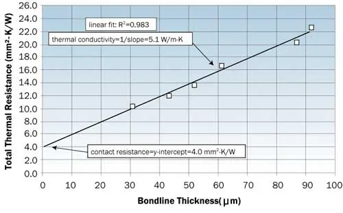 Usually the substrate samples are chosen to represent the materials and surface condition (surface finish, plating) of the surfaces, and machined to a standard sample geometry before the sandwich specimen is bonded. For a given adhesive or interface material and set of substrates, if the bondline thickness of a group of samples can be varied over a wide enough range, the measured total bondline resistance can be plotted as a function of bondline thickness. A linear least squares fit of the data results in a y-axis intercept equal to total contact resistance for the set of conditions (sum of both interfaces), and the reciprocal of the slope gives the thermal conductivity of the material. Figure 2 gives an example of data generated with silicon and copper-tungsten substrates and a high thermal conductivity grease.