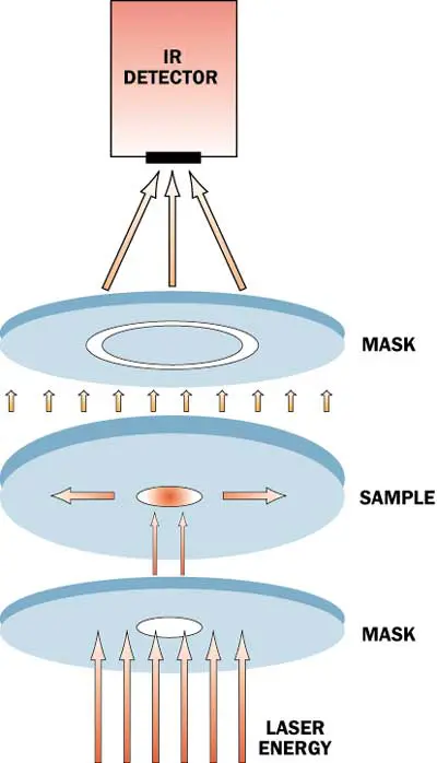 For materials that are isotropic in the plane, but have a different through-plane diffusivity, we have employed a modification of the standard flash method to measure the in-plane, or radial, thermal diffusivity. This method employs a mask to collimate the laser beam and heat an approximately 5 mm diameter spot on the front face of a 25 mm diameter disk (see Figure 4). This allows heat to flow through the thickness of the sample and spread out in the plane. Another mask is employed on the opposite face to define an annulus of approximately 8 to 10 mm in diameter that is exposed to the IR detector.
