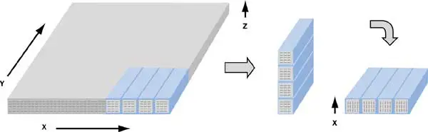For materials that are significantly thicker than 1 mm and where it is not desirable to machine the thickness down to 1 mm, or for materials that are anisotropic in the plane, an alternate method is used to measure the in-plane diffusivity. If the material thickness is not large enough to cut out a sample of a standard geometry from the direction of interest, a group of bars can be machined from the material, stacked up and held together to form a square sample such that the through-plane direction of the sample is the direction of interest, as shown in Figure 5. In this example, the diffusivity in the “x” in-plane direction of the material would be measured.