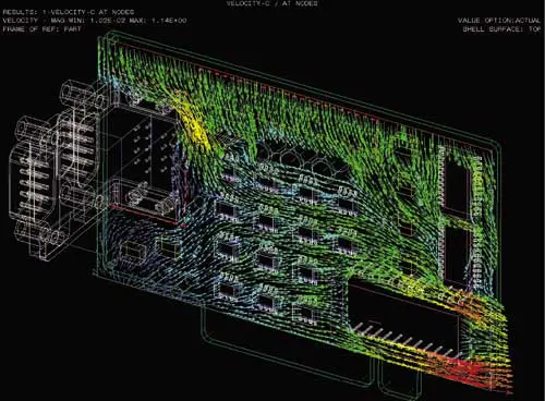 Figure 4. Example of a thermal/flow analysis on a PCB build using IDF-based data exchange.For the board, the thermal properties can be defined based on a stack of physical layers as well as conductors: