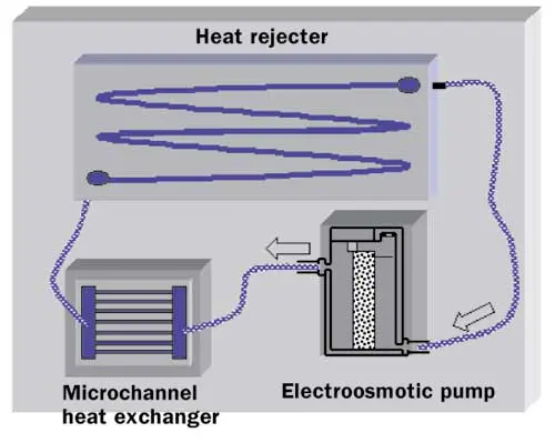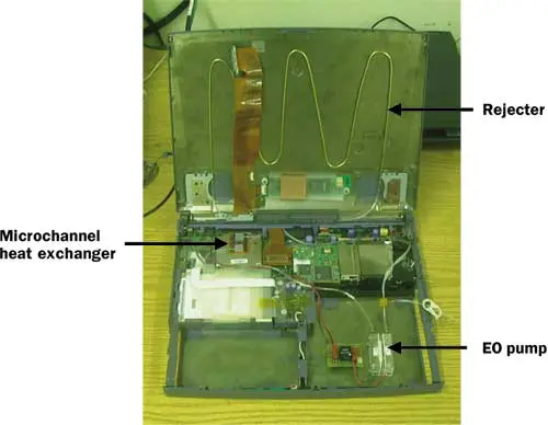Figure 2. The electroosmotic microchannel cooling system implemented in a laptop computer. A 1 cm x 1 cm silicon microchannel heat exchanger is attached to the processor. The rejecter coil and plate are located at the backside of the display panel. An EO pump propels water through the loop, making use of the power supply for the fan with a converter.A recent demonstration on an Intel thermal test chip removed a peak heat flux exceeding 100 W/cm2 and a total heat load exceeding 130 W. The microchannel heat sink was attached to the backside of the thermal chip using a thermal interface material with a thermal conductivity near 1.1 Wm-1K-1. The demonstration was performed with a minimum absolute pressure of 30 kPa and achieved a heat sink temperature of 85oC. The measured maximum junction temperature is about 110oC due to the thermal resistance of the interface material.