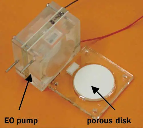 The pump developed at Stanford [4], (see Figure 3), consists of an ultra-fine porous glass filter disk as the active pumping structure, a catalytic gas recombiner, platinum electrodes, and Plexiglas machined parts. The pumping structure has a diameter of 30 mm, a thickness of 2 mm, and an effective pore diameter of 1 �m. Demonstrations have been performed for Intel and Apple using 1�M buffered de-ionized water (1 �M Na2B4O7 10 H2O dissolved into 1 liter de-ionized water) as the working fluid. The pumps provide the necessary flowrates (> 20 ml/min with 60 V/mm fields) and pressure drop (>2 bar with 100 V potential) using minimal volume and no moving parts.