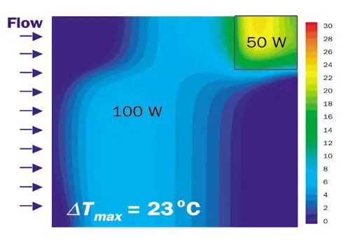 Figure 4. Simulated temperature distribution in a 20 mm x 20 mm chip heated non-uniformly and dissipated using a microchannel heat sink. A power of 50 W is concentrated at a 5 mm x 5 mm hotspot while 100 W is applied to the remainder of the chip. A thermal interface material with a thermal resistance of 0.1 cm2K/W is used between the heat sink and the thermal chip in the simulation. The liquid flowrate is 20 ml/min at the inlet with an exit pressure of 0.3 bar.In conclusion, electroosmotic microchannel cooling is promising for the cooling of future electronic systems. Demonstrations have been performed for Intel (single processor) and Apple (dual processor) systems with a total power removal exceeding 130 W. The technology offers very large peak heat removal capability while minimizing the occupation at the chip backside, and can remove extreme rates of heat generation using higher flowrates with optimal microchannel designs. The electroosmotic pump has no moving mechanical parts and generates little noise. The silicon microchannel heat exchanger can alleviate microprocessor hotspots to achieve better chip temperature uniformity.