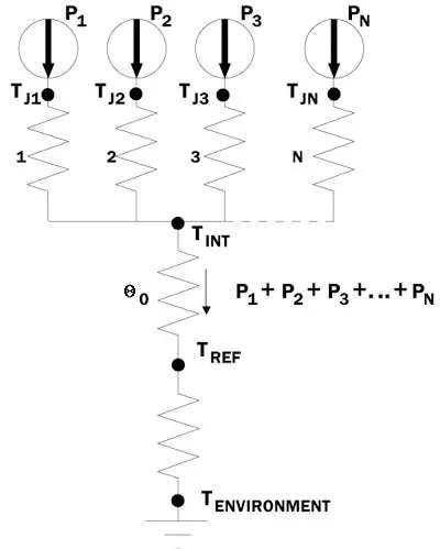 The resistor network in Figure 2 applies to lateral configuration. The assumption is that the heat from the various chips will flow along parallel paths, until the heat flux converges to a region internal to the package, with a characteristic temperature, TINT. From there the heat will flow to the reference location and then to the environment. The following equation provides a solution to the resistor network for calculating the temperature of the ith chip.