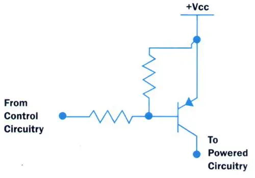An example circuit implementation appears in Figure 1. This shows a transistor implementation, but, depending on power needs, a FET or relay can also be used. The control circuitry (microprocessor, etc.) determines when the powered circuitry should be on or off.