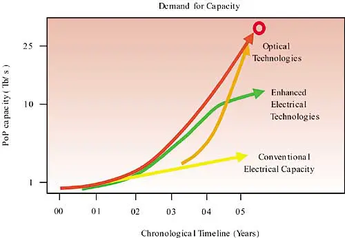 Despite the current downturn in the telecommunications industry, data transfer (i.e. network traffic) is continuing to grow at a 100% rate [1]. It is already projected that network traffic demand will reach tens of Tb/s in a couple of years from now (see predicted traffic demands from telecommunications analysts Ryan, Hankin & Kent, Figure 1). At the same time, network power requirements will scale with Internet growth. However, power demand may slow network growth.