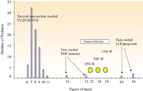 Figure 1. Distribution of energy density figure of merit.The distribution in Figure 1 shows that all natural convection cooled products in the company consumer electronics portfolio at that time had an FOM less than 12. The proposed monitor showed a much larger value, and much above its predecessors, actually in the region dominated by fan cooling.