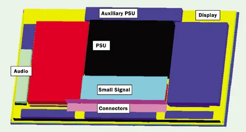 For the Flat TV monitor, the mechanical architecture of the set is thermally unfavorable. The layout of the display module forces the power supply and the small signal board to be in the middle of the set. The connectors to the mains and to external devices cannot be on top of the set, which leaves the power supply in the top middle of the set, with the bottom of the set below the Power Supply Unit (PSU) completely blocked by the connectors. The mechanical layout is shown in Figure 2.